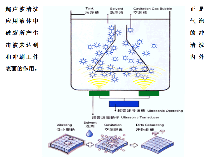 shou先我們來看下清洗原理:超聲波清洗機是利用高于20KHZ的超音頻信號,通過換能器轉換成高頻機械振蕩而傳入清洗液中,超聲波在清洗液中疏密相間地向前輻射,使液體流動并產生數以萬計的微小氣泡,這些氣泡是在超聲波縱向傳播形成的負壓區形成生長,而在正壓區迅速閉合,這些氣泡的形成生長及迅速閉合被稱為空化現象。在空化現象中,這些氣泡的閉合形成超過1000個大氣壓的瞬間高壓,連續不斷地瞬間高壓就象一連串小的“爆炸”不停地轟擊物體表面,使物體表面及縫隙之中的污垢迅速剝落,達到迅速清洗效果。 眾所周知,人們所聽到的聲音是頻率20~20000Hz的聲波信號,高于20000Hz的聲波稱之為超聲波,聲波的傳遞依照正弦曲線縱向傳播,即一層強一層弱,依次傳遞,當弱的聲波信號作用于液體中時,會對液體產生一定的負壓,使液體內形成許許多多微小的氣泡,而當強的聲波信號作用于液體時,則會對液體產生一定的正壓,因而,液體中形成的微小氣泡被壓碎。經研究證明:超聲波作用于液體中時,液體中每個氣泡的破裂會產生能量極大的沖擊波,相當于瞬間產生幾百度的高溫和高達上千個大氣壓,這種現象被稱之為“空化效應”,